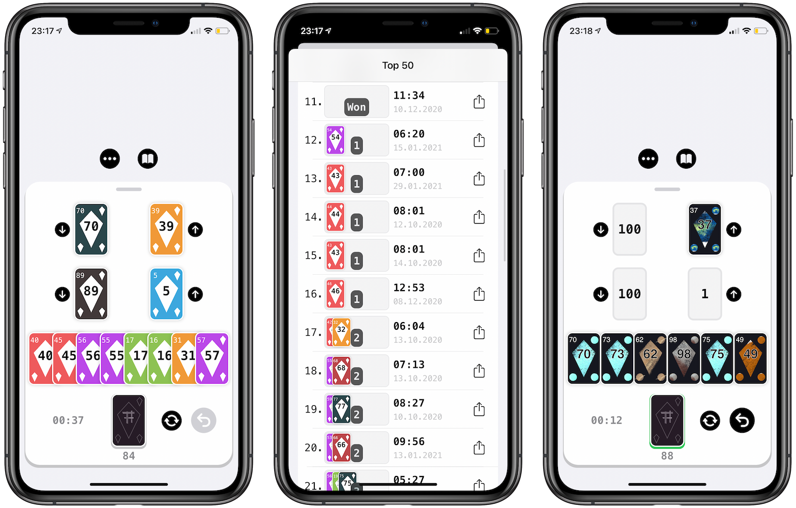A card game with only a few simple rules that is heavily inspired by the real-world game The Game but adapted for mobile. The deck consists of 98 cards labeled 2 to 99. The goal is to get rid of all of the cards in the deck. You do this by playing cards on one of four stacks. Each stack has a direction, meaning that only cards that have a higher or lower numerical value than the top card may be played.