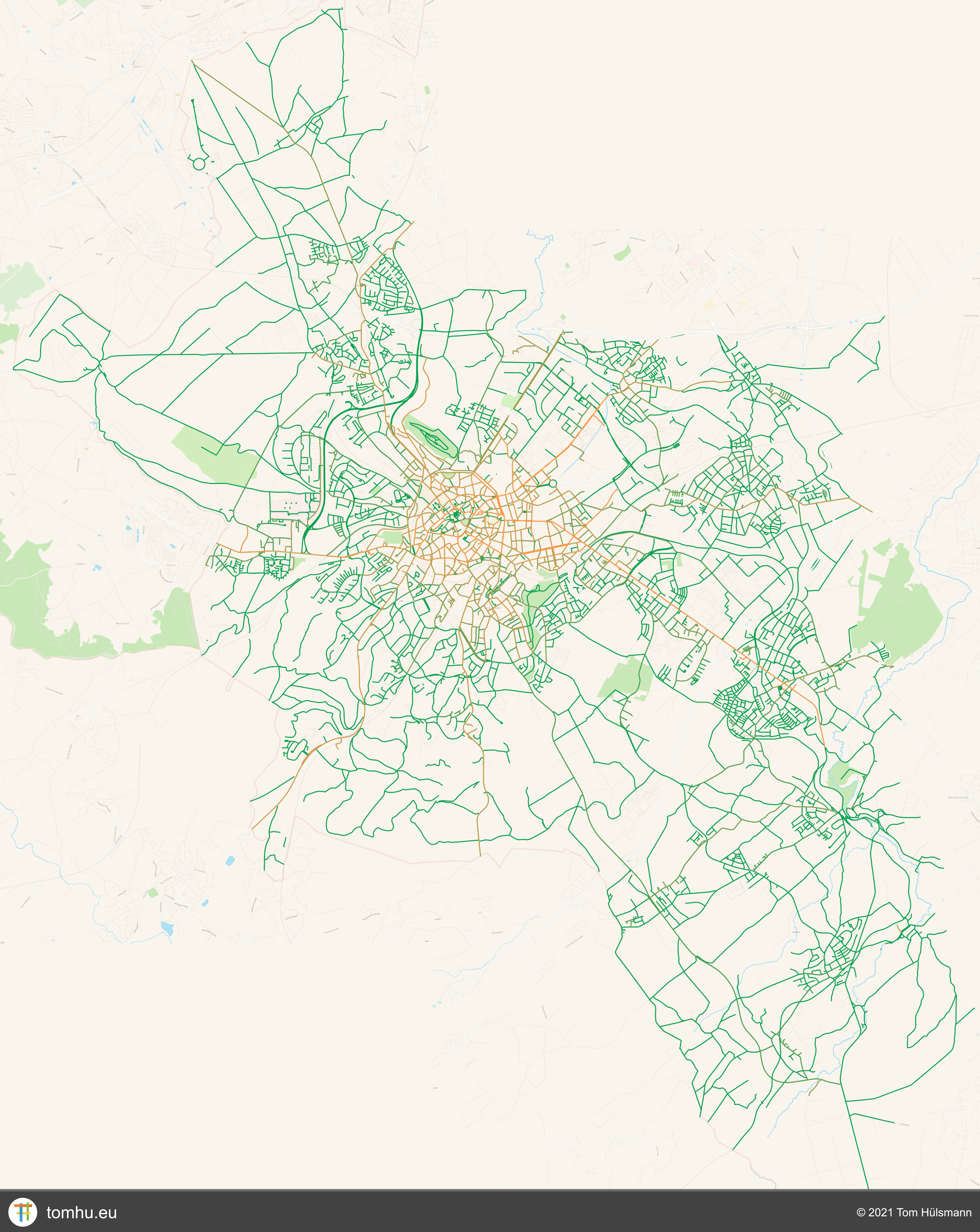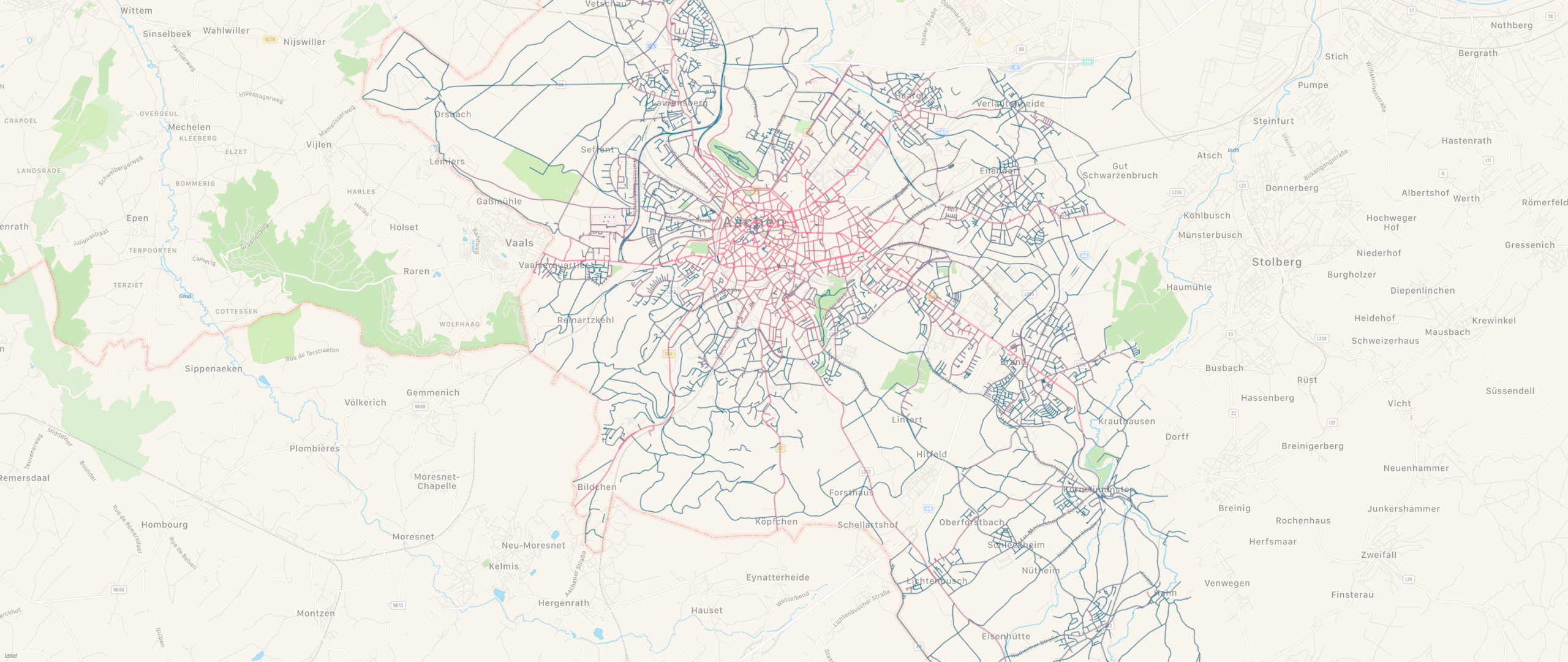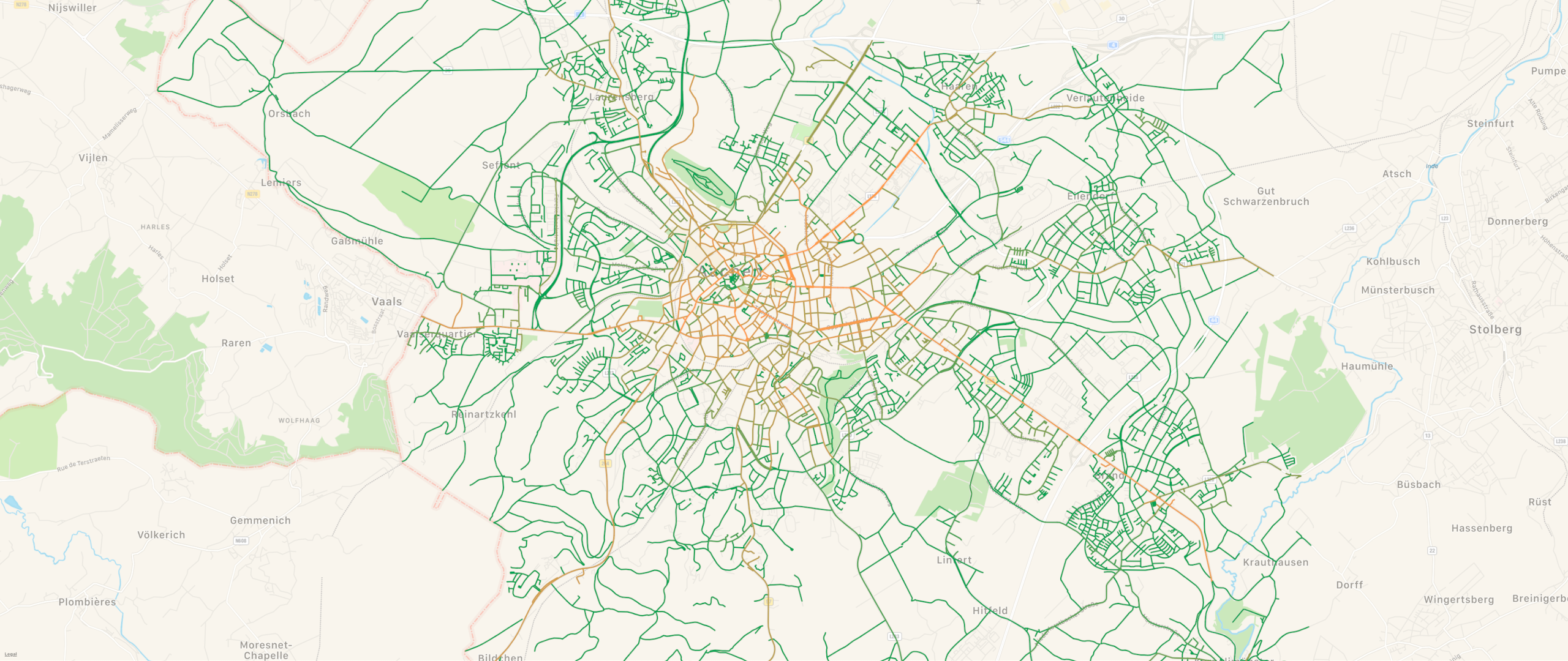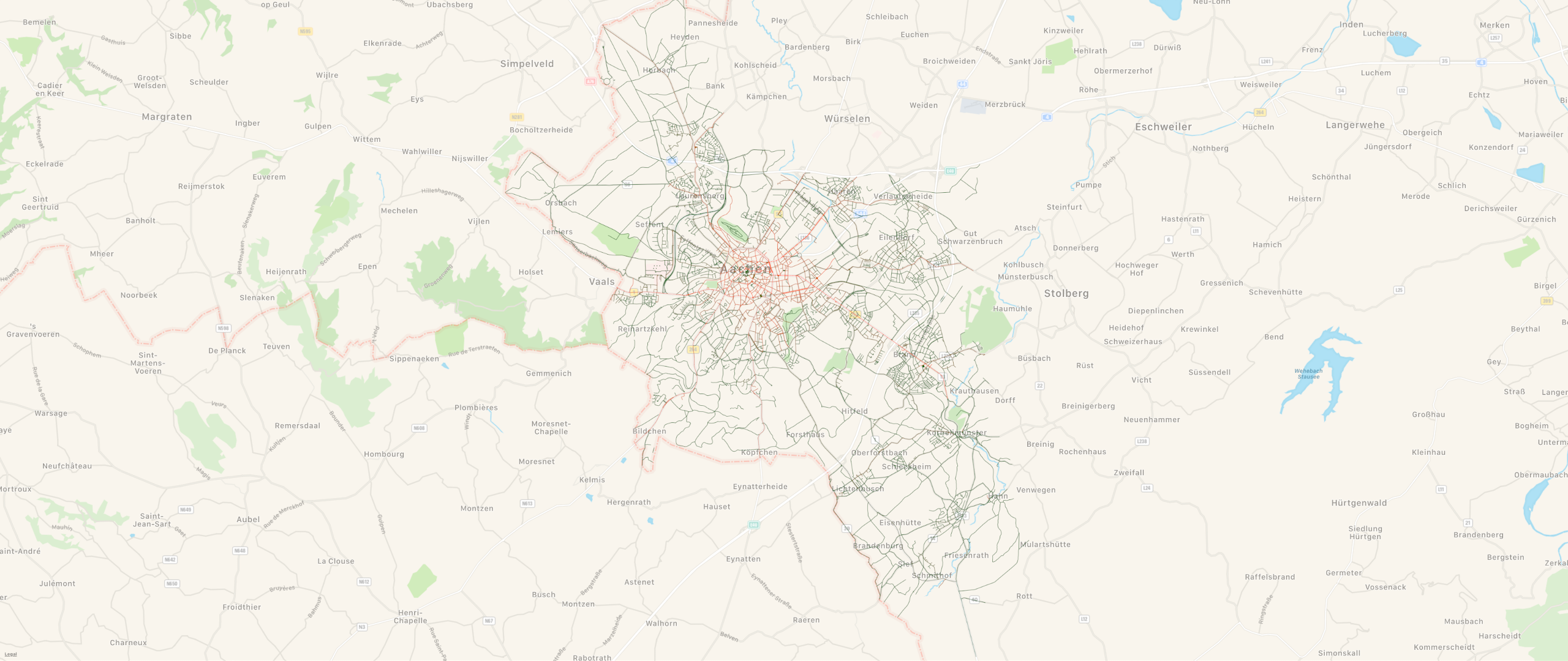 Since that was really slow, I made some optimizations and everything was now finally working! Success! For each street in Aachen, I now had the information on how many parking tickets were issued on that street in 2020. Add a nice little color gradient, draw the streets on the map and done! You can see excerpts of the result above and below.